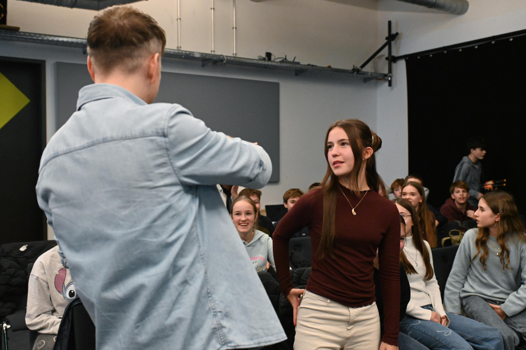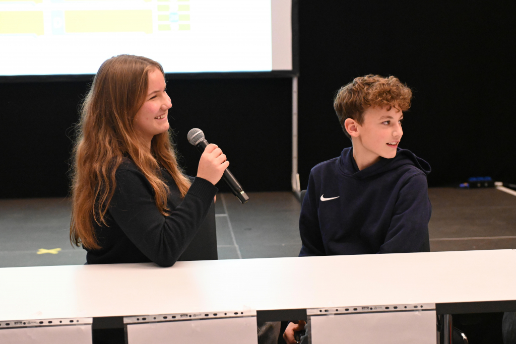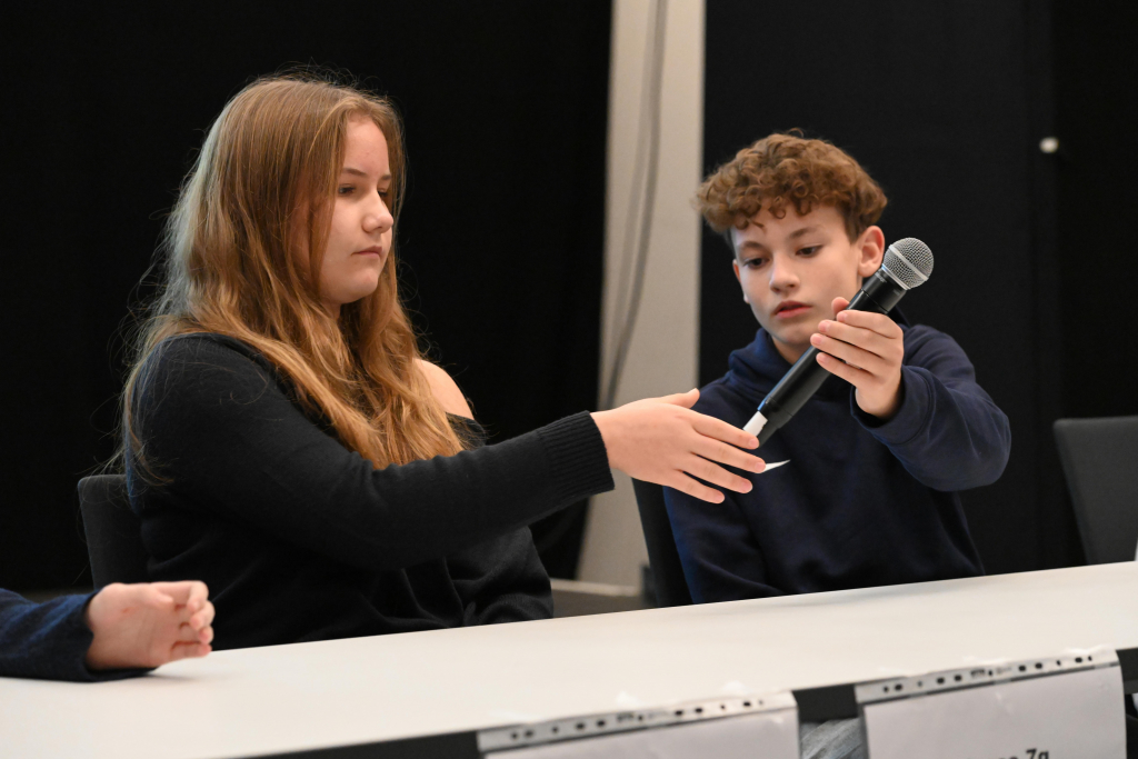 Die 7g trat mit einem schlagkräftigen Team an: Emmanuelle Krieger und Maximilian Höhl saßen auf dem Podium und stellten sich mutig den Fragen des Moderators Martin Tietjen. Unterstützt wurden sie von der Klasse im Saal – allen voran Maja Vayssière, die als Publikumsjoker einen wichtigen Beitrag leistete. Außerdem standen der Klasse ein Klassenjoker – als Sprecherin fungierte Charlotte Holste – sowie ein 50:50-Joker zur Verfügung, die strategisch klug eingesetzt wurden.