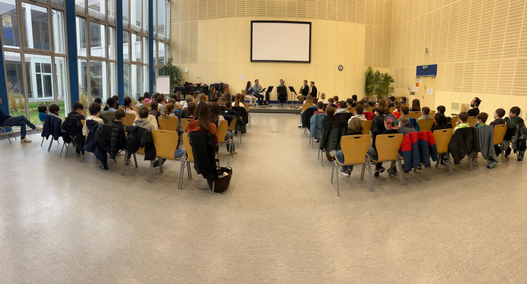 Im Dezember und März wurden die Klassen 6a, 6c, 6e und 5b von Musikern des Nationaltheaters in Speyer besucht. In zwei kleinen Gesprächskonzerten stellten die Profis den Schülerinnen und Schülern ihre Instrumente und ihre Arbeit im Theater vor. Mit viel Begeisterung konnten die SchülerInnen Melodien aus Peter und der Wolf oder Hänsel und Gretel erkennen und miterleben😊.