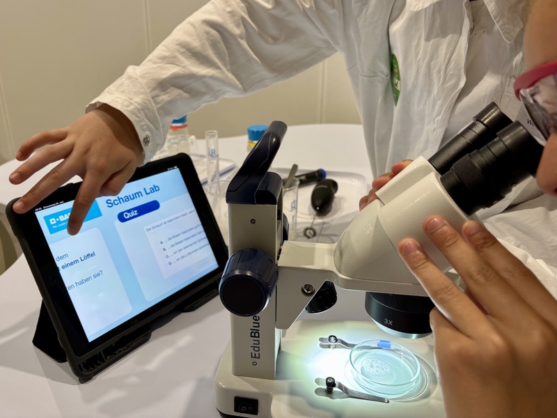 Eine andere Gruppe hat Schaum hergestellt. Das war richtig lustig! Wir haben Schaum „gebacken“, ihn mit dem Mikroskop untersucht und verschiedene feste Schaumstoffe getestet. Dabei haben wir gelernt, dass es flüssige und feste Schäume gibt und dass Schaum nicht nur beim Duschen vorkommt, sondern auch in Technik und Verpackungen genutzt wird.
